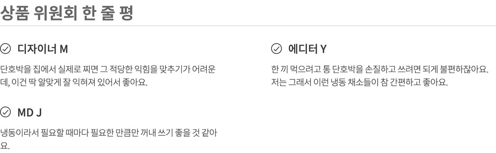 나와 내 가족이 먹고 쓸 상품을 고르는 마음으로 매주 상품을 직접 먹어보고, 경험해보고 성분, 맛, 안정성 등 다각도의 기준을 통과한 상품만을 판매합니다.(온라인 기준 / 자사몰, 직구 제외)