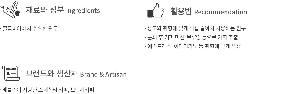 유의사항 ・분쇄되어 있지 않은 원두입니다. 수령하신 후 쓰임새에 맞도록 직접 갈아서 사용하세요.