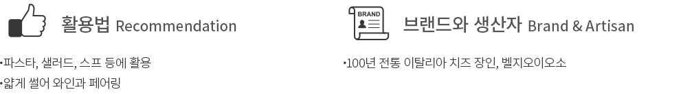 오랜 기다림으로 완성해 깊은 풍미가 돋보이는 벨지오이오소의 파마산 웻지를 소개할게요. 이탈리아 전통 방식으로 만든 파마산 치즈를 10개월간 숙성해 진한 맛을 자랑합니다. 고소하고 짭짤하면서도 견고한 질감이 돋보이지요. 그라인더로 갈아 파스타, 스프, 리조또 등에 토핑으로 더해 즐겨도 좋고요. 얇게 썰어 와인과 함께 즐겨도 제격일 거예요.