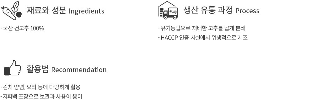 ・특징 : 국산 유기농 고추를 곱게 갈아 만든 고춧가루예요. 김장, 무침 요리 등에 두루 활용하기 좋은 입자 크기를 지녔어요.