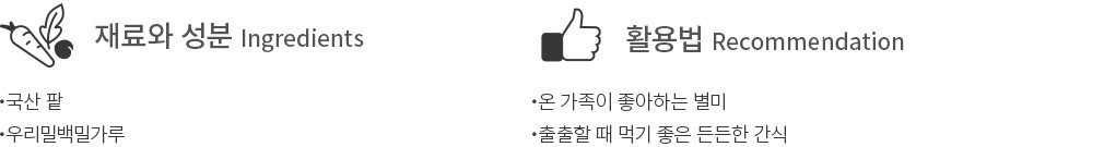- 우유, 밀 함유 *알류(달걀), 메밀, 대두, 땅콩, 잣, 게, 새우, 돼지고기, 복숭아, 토마토, 호두, 오징어, 닭고기, 쇠고기, 조개류(굴, 홍합 포함) 혼입가능