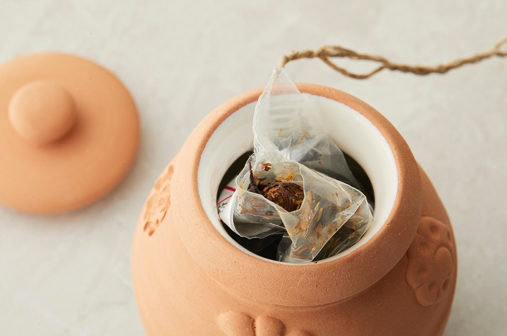 이렇게 사용하세요 ・ 포푸리 잎을 비닐에 동봉해 테라코타 용기 안에 담아 보내드려요.