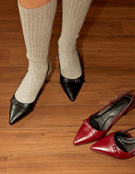 앞코가 뾰족한 포인트 토 스타일로, 발등 부분에 있는 스트랩과 작은 버클 장식이 클래식하고 세련된 느낌을 더해줍니다.