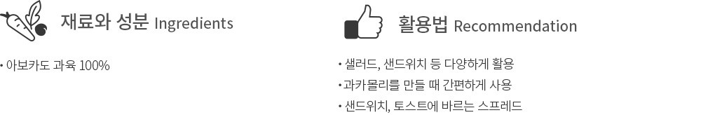 활용팁 ・아보카도 토스트 : 바삭하게 구운 사워도우에 아보카도 퓨레를 바르고, 수란, 토마토 등을 올려 토스트로 즐겨보세요.