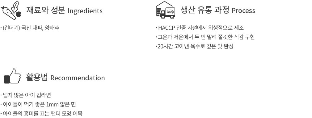 진한 소고기 육수에 파프리카와 고추가루로 맛과 색을 내, 아이가 먹어도 짜거나 맵지 않게 즐길 수 있는 라면이에요. 동결건조한 건더기는 국산 야채의 영양을 그대로 보존하고 있죠. 팬더 모양 어묵까지 쏙쏙 골라 먹는 재미가 있어, 라면을 자주 찾는 아이에게 끓여주기에 좋답니다.