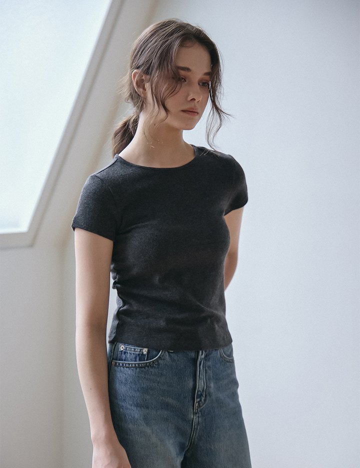 스판사가 섞인 면 혼방 소재의 반팔 티셔츠입니다. 부드러운 터치감이 특징입니다.