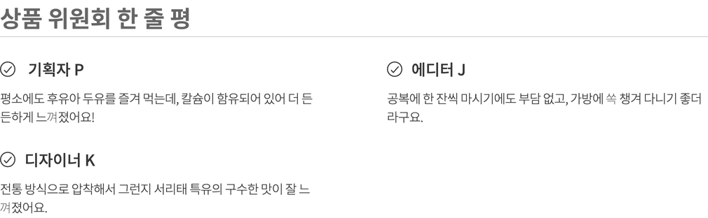 나와 내 가족이 먹고 쓸 상품을 고르는 마음으로 매주 상품을 직접 먹어보고, 경험해보고 성분, 맛, 안정성 등 다각도의 기준을 통과한 상품만을 판매합니다.(온라인 기준 / 자사몰, 직구 제외)