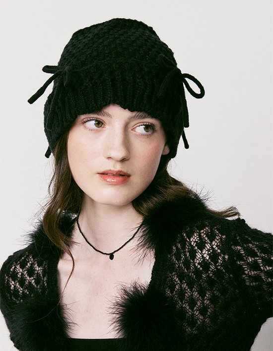 니트 모자와 동일한 소재의 리본이 모자를 둘러 장식되어있어 트렌디한 분위기가 강조되는 니트 소재 버킷햇 입니다.
