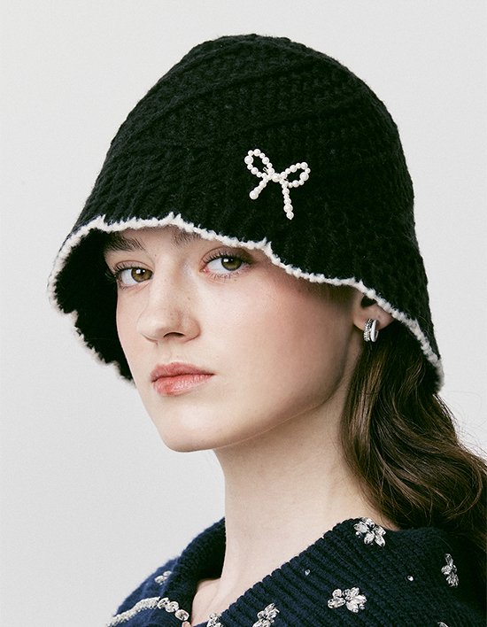진주로 만들어진 리본 형태의 브로치가 탈부착 가능하여 자유롭게 연출 가능한 니트 소재 버킷햇 입니다.