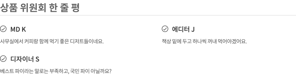 나와 내 가족이 먹고 쓸 상품을 고르는 마음으로 매주 상품을 직접 먹어보고, 경험해보고 성분, 맛, 안정성 등 다각도의 기준을 통과한 상품만을 판매합니다.(온라인 기준 / 자사몰, 직구 제외)