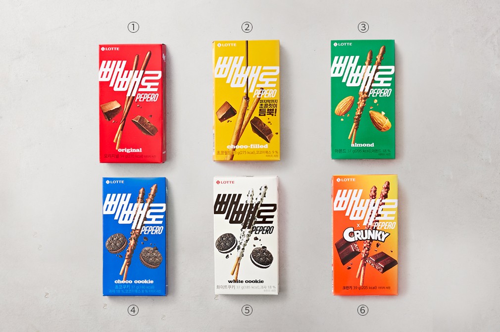 ・구성: ①오리지널 빼빼로(54g X 1개), ②초코필드 빼빼로(53g X 1개), ③아몬드 빼빼로(37g X 1개), ④초코쿠키 빼빼로(37g X 1개), ⑤화이트 쿠키 빼빼로(37g X 1개), ⑥크런키 빼빼로(39g X 1개)