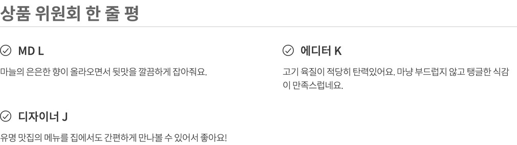 나와 내 가족이 먹고 쓸 상품을 고르는 마음으로 매주 상품을 직접 먹어보고, 경험해보고 성분, 맛, 안정성 등 다각도의 기준을 통과한 상품만을 판매합니다.(온라인 기준 / 자사몰, 직구 제외)