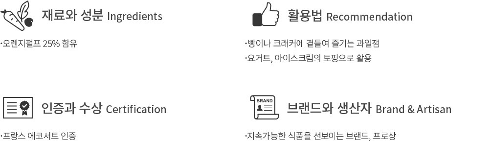프로상은 1968년 프랑스에서 시작된 브랜드로, 좋은 품질의 원재료만을 사용하여 지속 가능한 제품을 선보이고 있습니다. 이번에 소개할 제품은 유기농 오렌지로 만든 마멀레이드잼이에요. 작은 오렌지 껍질이 씹힐 때마다 약간의 쌉쌀함과 함께 상큼한 풍미가 입안 가득 퍼진답니다. 프랑스의 에코서트 인증까지 받았으니 더욱 안심이죠. 노릇하게 구운 빵이나 그릭 요거트에 곁들여 즐겨 보세요.
