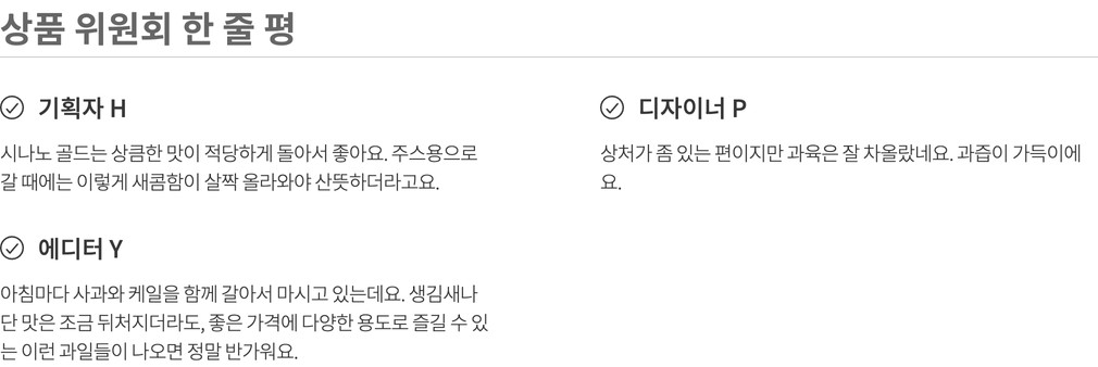 나와 내 가족이 먹고 쓸 상품을 고르는 마음으로 매주 상품을 직접 먹어보고, 경험해보고 성분, 맛, 안정성 등 다각도의 기준을 통과한 상품만을 판매합니다.(온라인 기준 / 자사몰, 직구 제외)
