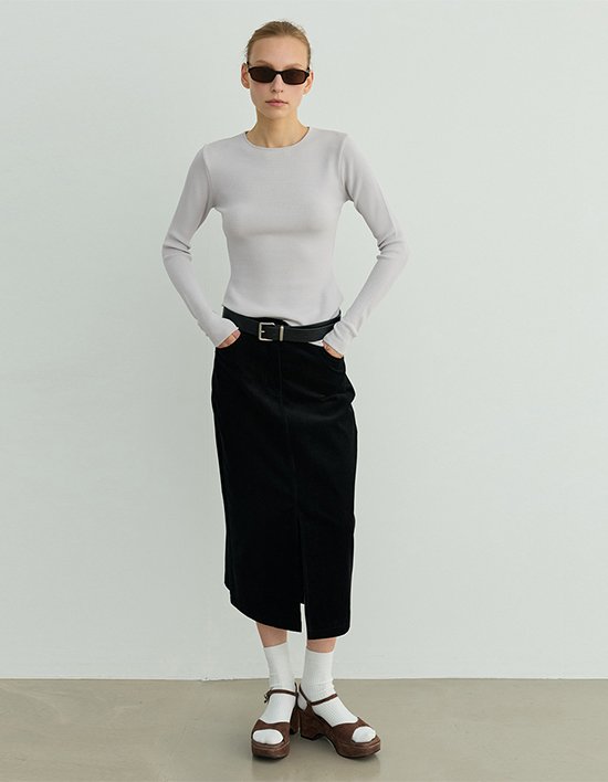 포근한 무드가 느껴지는 코듀로이 원단으로 제작된 H라인 슬릿 스커트