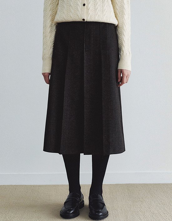 [로에일] 헤링본 울 플리츠 미디 스커트 - 브라운