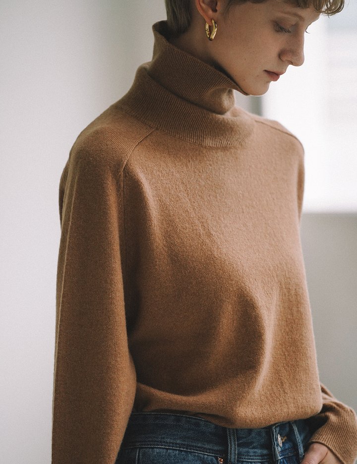 캐시미어 혼방 소재로 제작되어 고급스러운 외관과 뛰어난 발색력을 자랑하는 터틀넥 니트입니다.