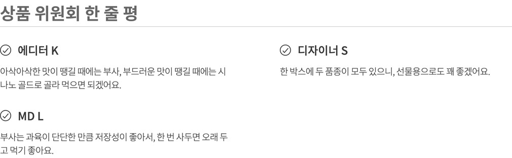 나와 내 가족이 먹고 쓸 상품을 고르는 마음으로 매주 상품을 직접 먹어보고, 경험해보고 성분, 맛, 안정성 등 다각도의 기준을 통과한 상품만을 판매합니다.(온라인 기준 / 자사몰, 직구 제외)