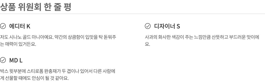 나와 내 가족이 먹고 쓸 상품을 고르는 마음으로 매주 상품을 직접 먹어보고, 경험해보고 성분, 맛, 안정성 등 다각도의 기준을 통과한 상품만을 판매합니다.(온라인 기준 / 자사몰, 직구 제외)