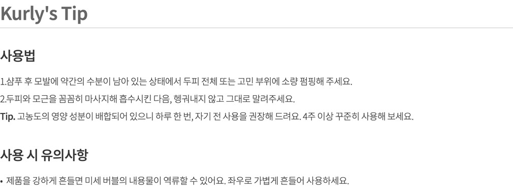 사용 전 제품을 충분히 흔들어 준 다음에 두피에 적당량을 골고루 바른 다음 손가락을 이용하여 마사지 하듯이 하여 충분히 흡수되도록 문질러줍니다.