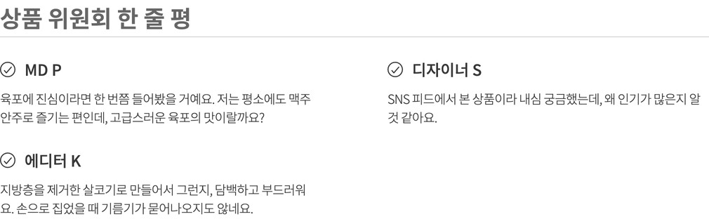 나와 내 가족이 먹고 쓸 상품을 고르는 마음으로 매주 상품을 직접 먹어보고, 경험해보고 성분, 맛, 안정성 등 다각도의 기준을 통과한 상품만을 판매합니다.(온라인 기준 / 자사몰, 직구 제외)