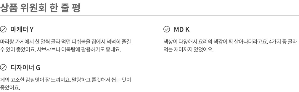 나와 내 가족이 먹고 쓸 상품을 고르는 마음으로 매주 상품을 직접 먹어보고, 경험해보고 성분, 맛, 안정성 등 다각도의 기준을 통과한 상품만을 판매합니다.(온라인 기준 / 자사몰, 직구 제외)