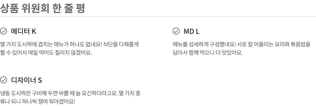 나와 내 가족이 먹고 쓸 상품을 고르는 마음으로 매주 상품을 직접 먹어보고, 경험해보고 성분, 맛, 안정성 등 다각도의 기준을 통과한 상품만을 판매합니다.(온라인 기준 / 자사몰, 직구 제외)