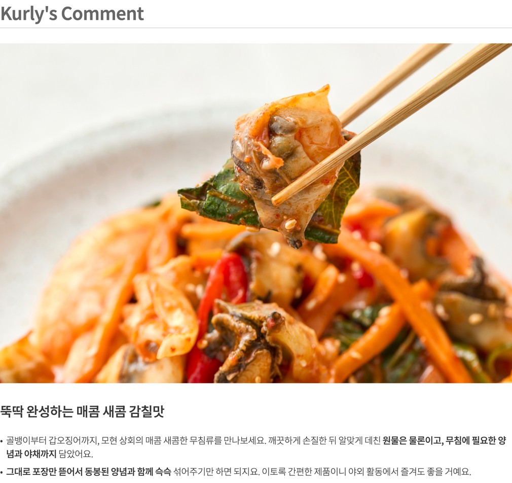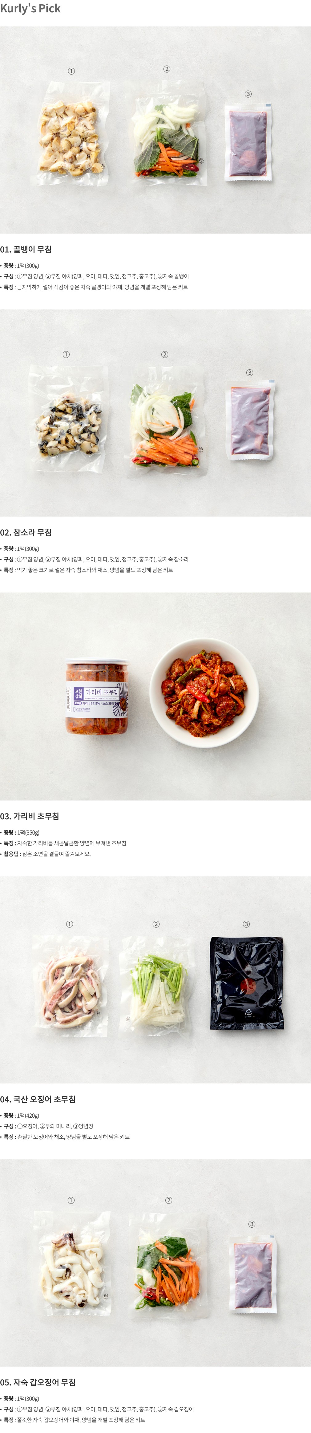 골뱅이초무침 -밀 함유 -본 제품은 난류, 대두, 밀, 고등어, 새우, 게, 아황산류, 오징어, 조개류(굴, 전복, 홍합 포함)을 사용한 제품과 같은 제조시설에서 제조 참소라무침 -밀, 조개류(소라) 함유 -본 제품은 난류, 대두, 밀, 고등어, 새우, 게, 아황산류, 오징어, 조개류(굴, 전복, 홍합 포함)을 사용한 제품과 같은 제조시설에서 제조 가리비무침 -조개류(가리비), 대두, 밀 함유 -본 제품은 난류, 대두, 밀, 고등어, 새우, 게, 아황산류, 오징어, 조개류(굴, 전복, 홍합 포함)을 사용한 제품과 같은 제조시설에서 제조 오징어초무침 -오징어, 대두, 밀, 쇠고기, 우유 함유 -본 제품은 난류, 대두, 밀, 고등어, 새우, 게, 아황산류, 오징어, 조개류(굴, 전복, 홍합 포함)을 사용한 제품과 같은 제조시설에서 제조 갑오징어무침 -오징어, 밀 함유 -본 제품은 난류, 대두, 밀, 고등어, 새우, 게, 아황산류, 오징어, 조개류(굴, 전복, 홍합 포함)을 사용한 제품과 같은 제조시설에서 제조