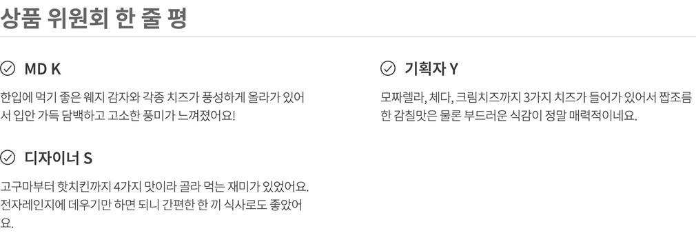 나와 내 가족이 먹고 쓸 상품을 고르는 마음으로 매주 상품을 직접 먹어보고, 경험해보고 성분, 맛, 안정성 등 다각도의 기준을 통과한 상품만을 판매합니다.(온라인 기준 / 자사몰, 직구 제외)