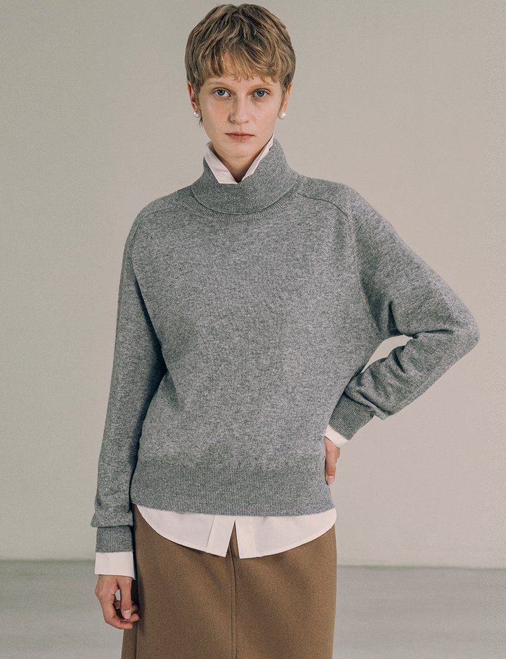 캐시미어 혼방 소재로 제작되어 고급스러운 외관과 뛰어난 발색력을 자랑하는 터틀넥 니트입니다.
