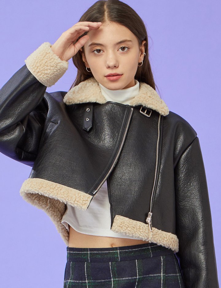 [콜릿] WOMEN 크롭 오버핏 B-3 무스탕 플리스 자켓_Black_Beige