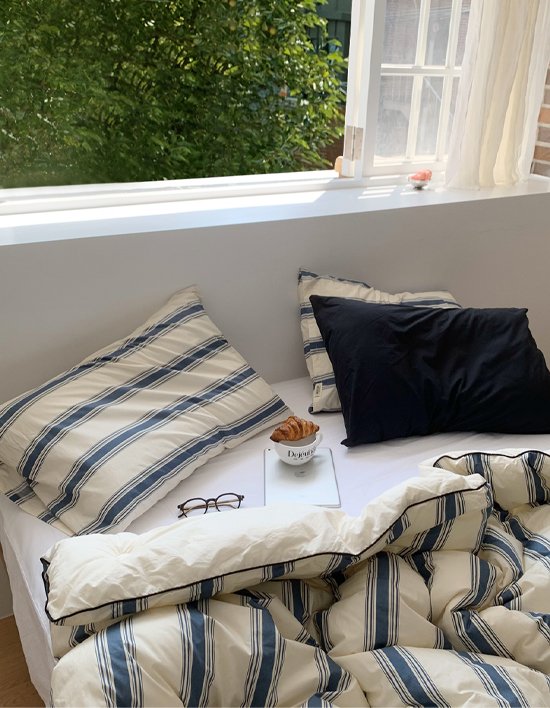 볼드한 스트라이프 디자인과 프렌치한 무드의 비비홈 자체제작 침구