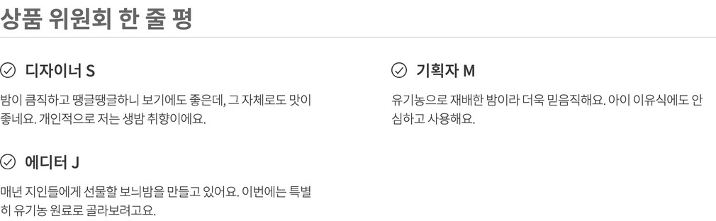 나와 내 가족이 먹고 쓸 상품을 고르는 마음으로 매주 상품을 직접 먹어보고, 경험해보고 성분, 맛, 안정성 등 다각도의 기준을 통과한 상품만을 판매합니다.(온라인 기준 / 자사몰, 직구 제외)