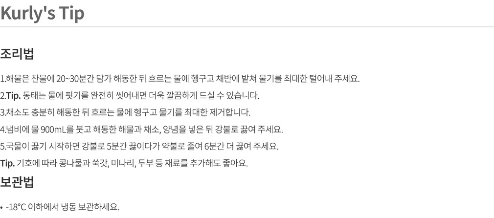 - 대두, 밀, 게, 새우, 쇠고기, 오징어, 조개류(홍합, 바지락) 함유