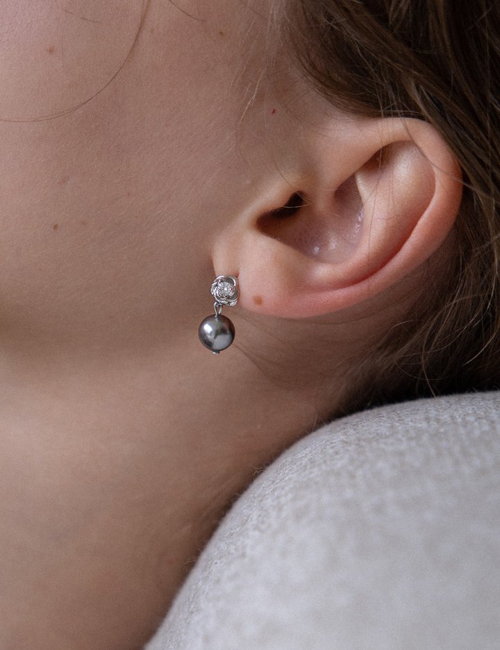 [메리모티브] 장미 실버 진주 드롭 귀걸이 (Free)
