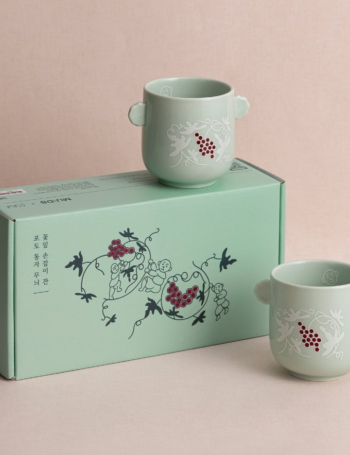 [쓰임] 국립박물관/포도 동자 무늬 꽃잎 손잡이 잔2P