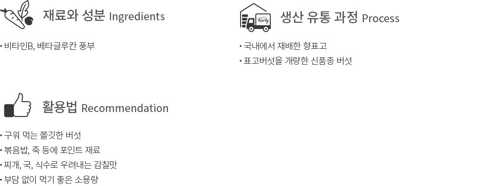 활용팁 ・큼직하게 썰어낸 솔송화버섯을 구워 샐러드에 곁들여보세요. 고유의 향긋함이 더해진답니다.