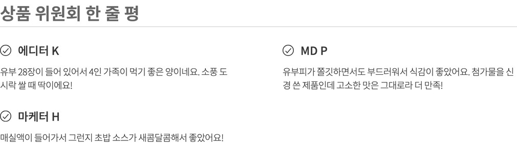 나와 내 가족이 먹고 쓸 상품을 고르는 마음으로 매주 상품을 직접 먹어보고, 경험해보고 성분, 맛, 안정성 등 다각도의 기준을 통과한 상품만을 판매합니다.(온라인 기준 / 자사몰, 직구 제외)