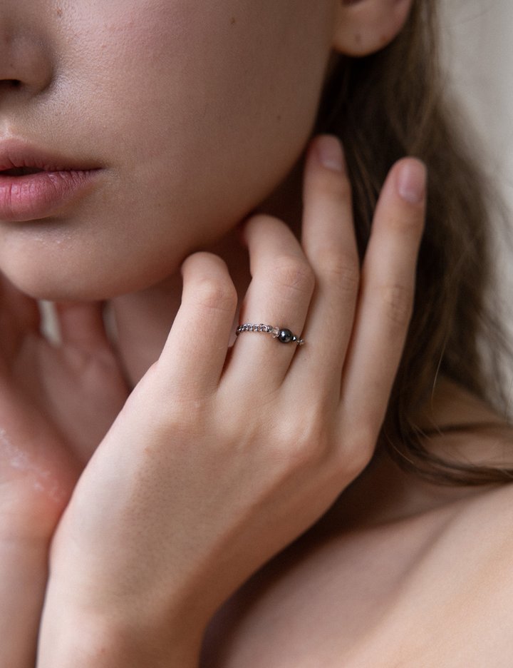 [메리모티브] 블랙 진주 크리스탈 체인 반지