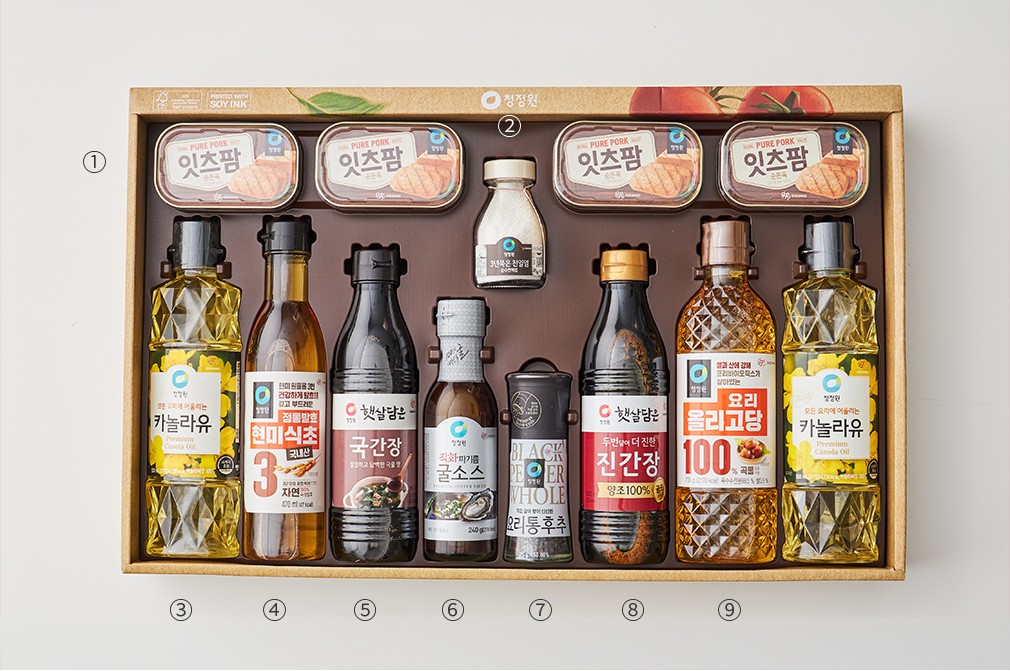 행복고급2호 ・구성 : ①잇츠팜, ②3년묵은 천일염, ③카놀라유, ④정통 현미식초, ⑤햇살담은 국간장, ⑥직화파기름 굴소스, ⑦요리통후추, ⑧햇살담은 두번달여 더 진한 진간장 골드, ⑨요리올리고당