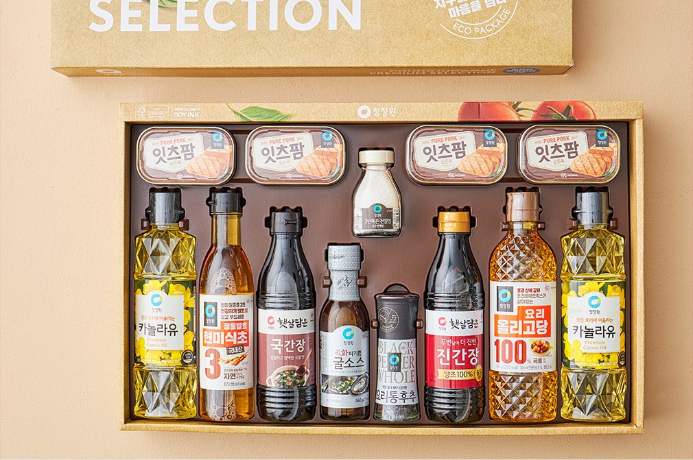 주방 필수품을 풍성하게 담은 청정원의 선물세트를 만나 보세요. 기본 중의 기본인 양념부터 반찬으로 먹기 좋은 햄까지, 9가지 상품을 다채롭게 담았답니다. 깔끔한 상자에 보내드리니 가까운 지인에게 건네는 선물로 추천할게요.
