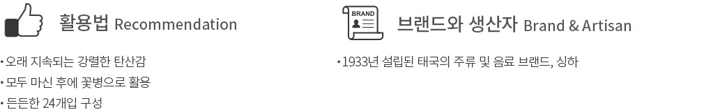 ‘싱하’라는 독특한 이름은 태국을 수호하는 환상 속 동물을 뜻합니다. 우리나라의 ‘해태’와 같이 국민에게 매우 친숙한 존재죠. 그런 이유에서인지 싱하 소다 워터는 태국 내 시장점유율이 95%에 달할 정도로 절대적 우위에 있는 탄산수로, 1933년부터 꾸준히 함께하고 있습니다. 태국에서 탄산수가 들어가는 모든 음료는 싱하 소다 워터로 만들어지고 있다는 사실을 보면 알 수 있죠! 오랜 역사와 전통으로 다져진 기술력을 바탕으로, 태국은 물론 세계 곳곳에서 수출되고 있는 ‘싱하 소다 워터’는 세계적으로도 높은 브랜드 가치와 품질을 자랑하고 있답니다.