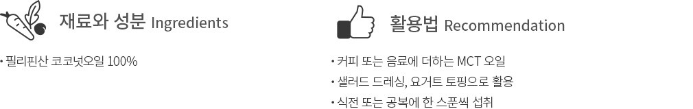 유의사항 ・ 처음 MCT 오일을 접할 경우, 과량 복용 시 복통이나 설사를 경험할 수 있어요. 초반 일주일은 하루 3~5g 이하의 적은 양으로 천천히 섭취해 주세요.