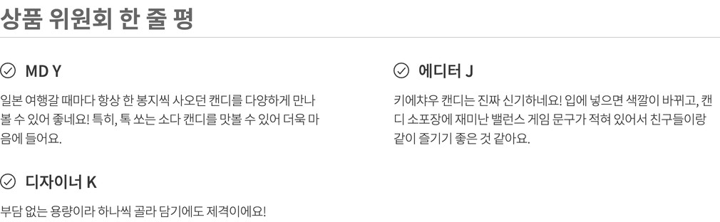 나와 내 가족이 먹고 쓸 상품을 고르는 마음으로 매주 상품을 직접 먹어보고, 경험해보고 성분, 맛, 안정성 등 다각도의 기준을 통과한 상품만을 판매합니다.(온라인 기준 / 자사몰, 직구 제외)