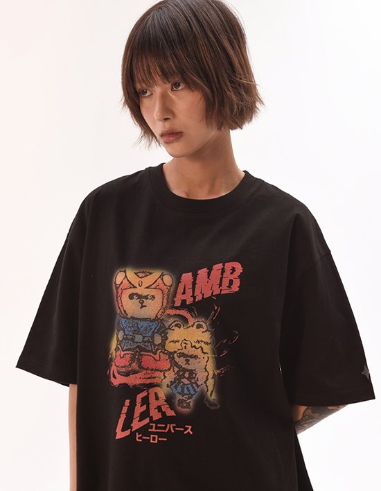 거친 회오리를 뚫고 히어로곰들이 등장했습니다! 나염기법을 통해 빈티지한 색감을 사용하여 레트로함과 힙한 분위기가 느껴지는 반팔 티셔츠