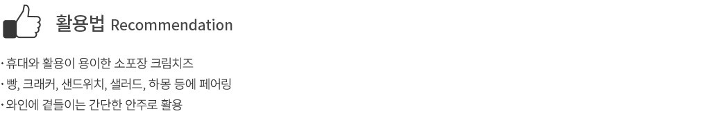 ・활용팁 : 도톰한 치즈를 한 입 크기로 썰어 먹으면 풍성한 고소함을 즐길 수 있어요. 스프레드용 크림치즈처럼 얇게 발라서 드셔도 좋습니다.