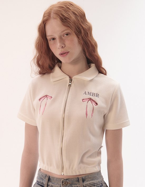 [엠블러] More ribbon please 크롭 카라집업 반팔티셔츠 ACZ201 아이보리