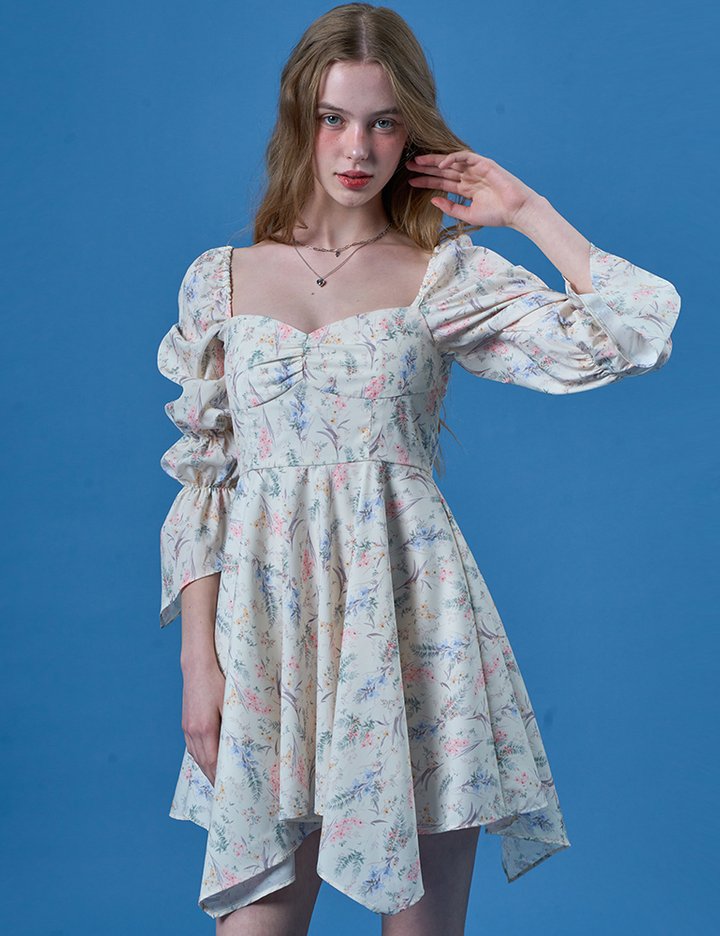 [콜릿] 셔링 플레어 언발란스 플로럴 미니원피스 (커스터드)