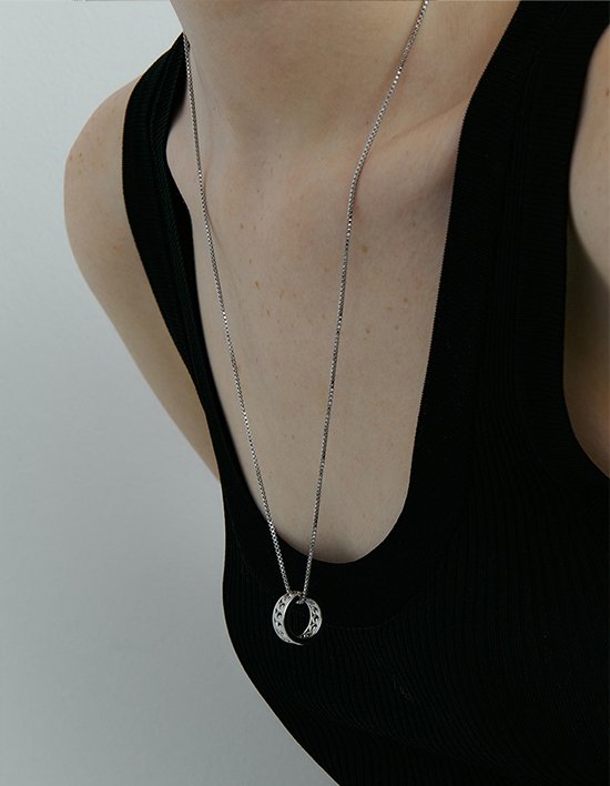 시크한 무드의 체인 반지를 긴 체인 목걸이에 걸어 유니크한 포인트를 더한 디자인