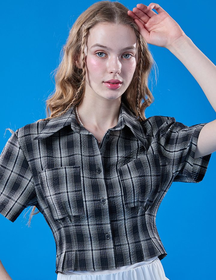 [콜릿] 여름 휴양지 체크 쿨링 슬림 크롭 반팔셔츠 (BLACK)